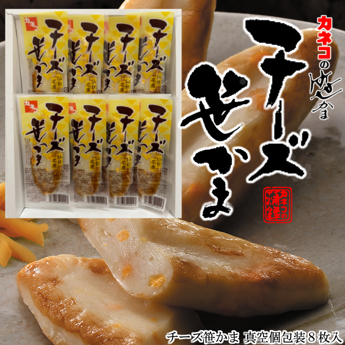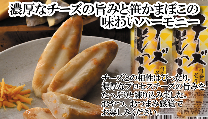 チーズ笹かま 濃厚なチーズの旨みと笹かまぼこの味わいハーモニー。 チーズとの相性はぴったり。濃厚なプロセスチーズの旨みをたっぷりと練り込みました。 美味しさ長持ち♪ 【化粧箱入り】【各種のし対応】